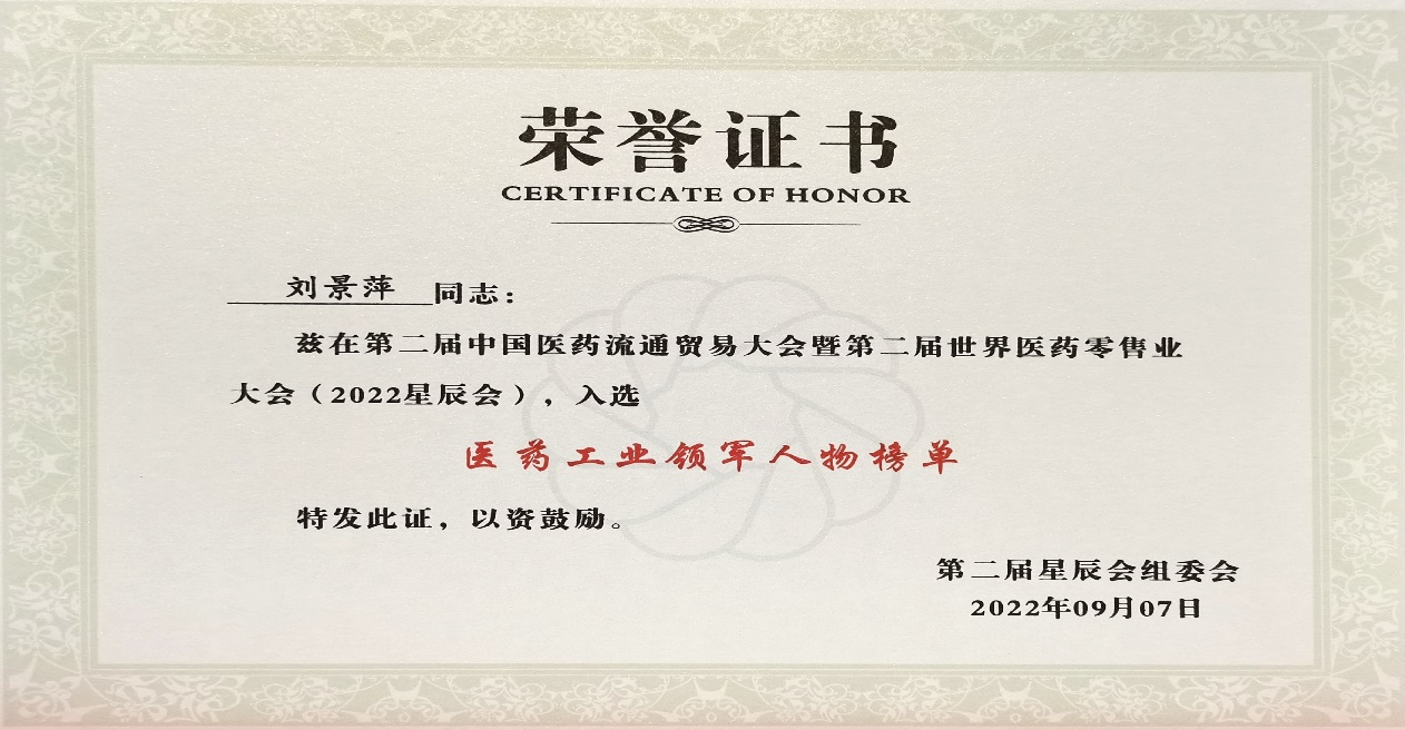 本次星辰会期间,w66旗舰厅斩获颇丰,获得多项行业奖项及荣誉。在开幕式上,刘景萍董事长荣获“医药工业领军人物”称号。
