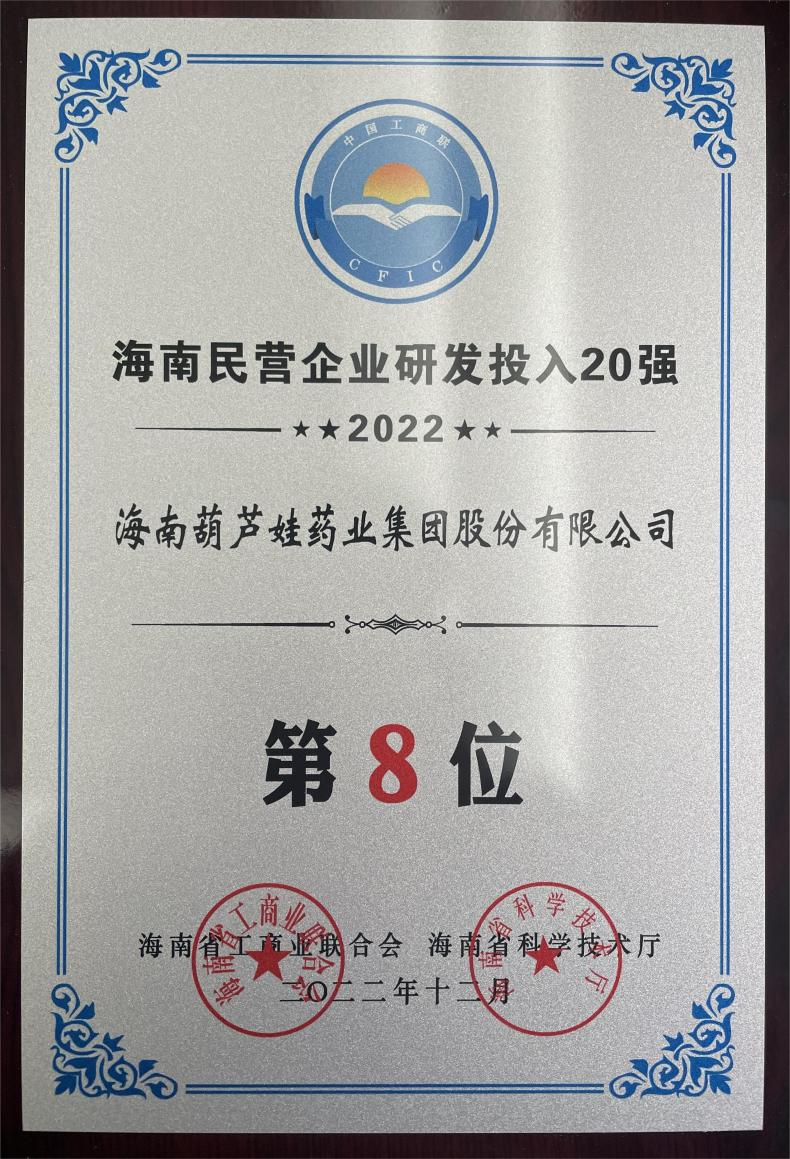12月23日,2022海南民营企业50强和研发投入20强发布会在海口举行。会上发布了“2022海南民营企业50强”“2022海南民营企业研发投入20强”榜单和分析报告。w66旗舰厅药业再次荣登两榜,在海南民营企业50强榜单中位列第25位,较去年上升8位,这也是公司连续三年登榜;在海南民营企业研发投入20强中位列第8位,较去年上升7位。